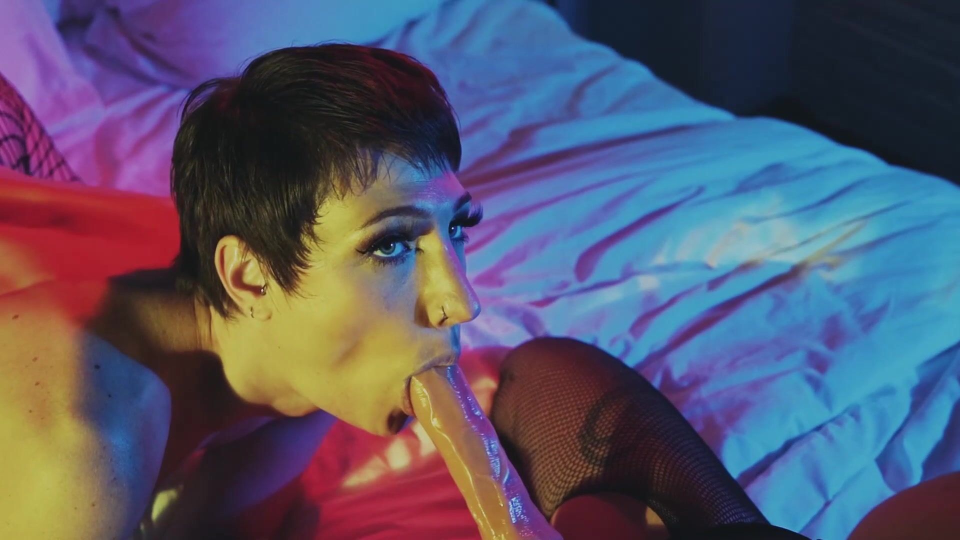 Short Haired Lesbian Babes Angelamour And Modeljenlynn Strapon Fucking In Fishnet