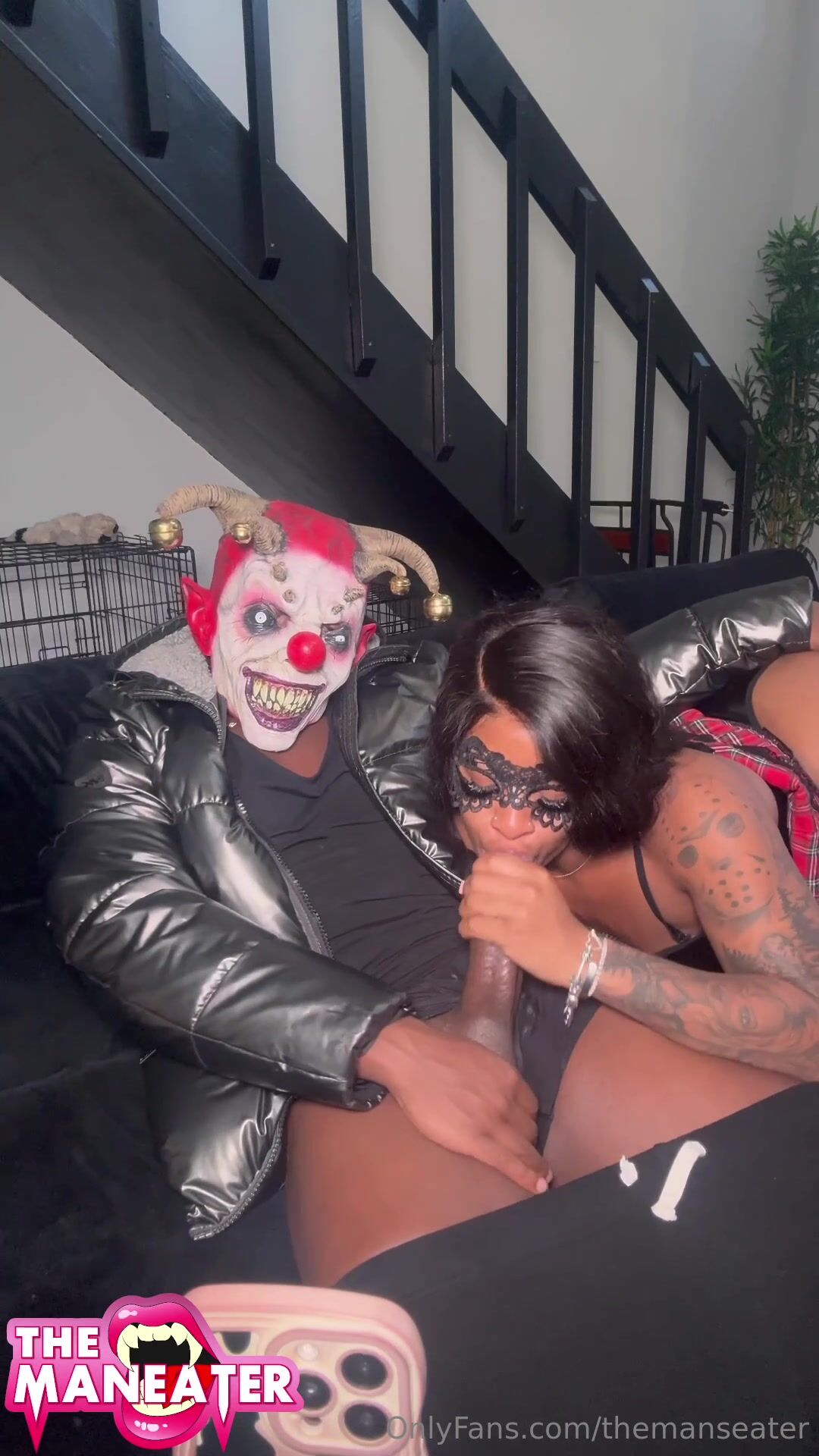Themanseater and Aquazay ebony cosplay beauty screwing clown, her masked form taking BBC POV facial in clown cum on pussy bliss. The clown makeup adds whimsical kink to the intense ride, perfect for ebony cosplay fans craving playful black dominance and messy painted finish.